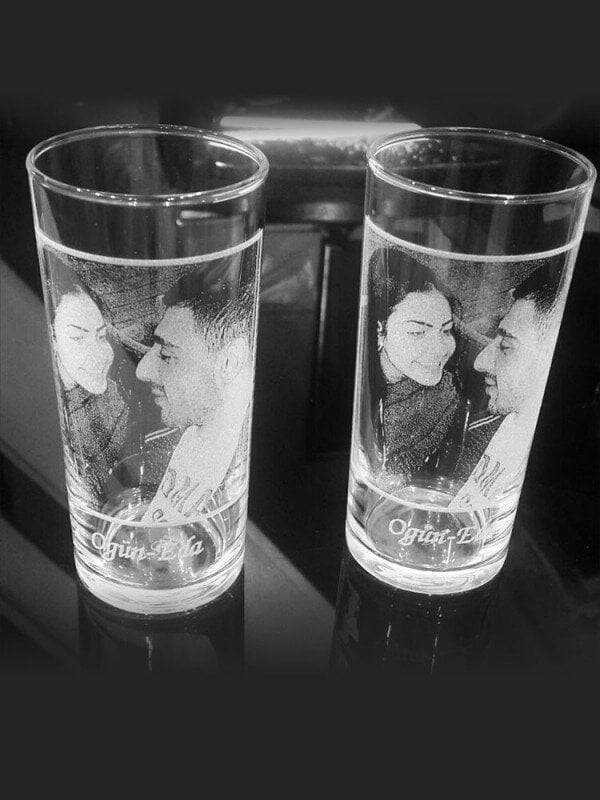 İşlem sonucunda ortaya çıkan bu ürün çok estetik ve benzeri olmayan bir işlem olacaktır. Bu işlemde 2 adet rakı bardağı üretilmektedir. İkisinde de ayrı ayrı fotoğraflar kullanabilirsiniz. Dilerseniz aynı fotoğrafı iki bardağa da uygulayabiliriz. Fotoğrafların altına tarih, güzel söz veya isim yazdırabilirsiniz. Hiçbir şey yazılmasını istemiyorsanız lütfen boş bırakın.