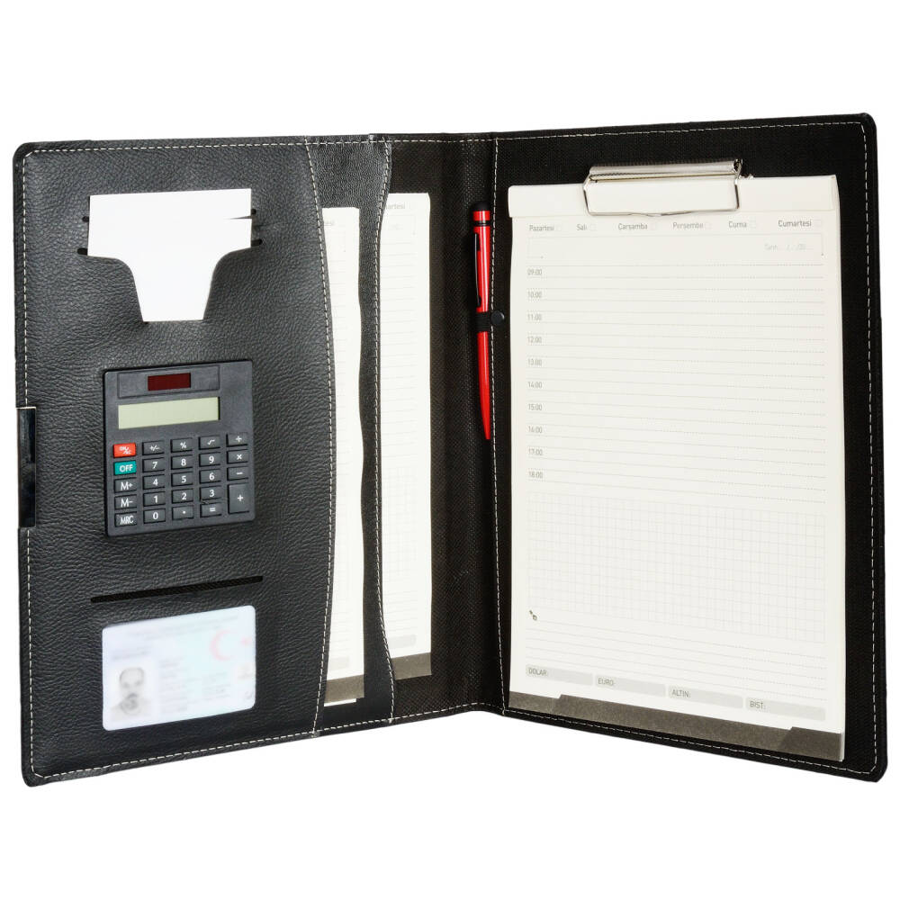 *23 x 31 cm *A4 Boyut *Mekanizmalı *Termo Deri Kapak *Yuvarlak Köşe *Hesap Makinesi *Kutulu *Kalem aksesuardır. *Baskı: Sıcak, UV, Serigrafi, Lazer
