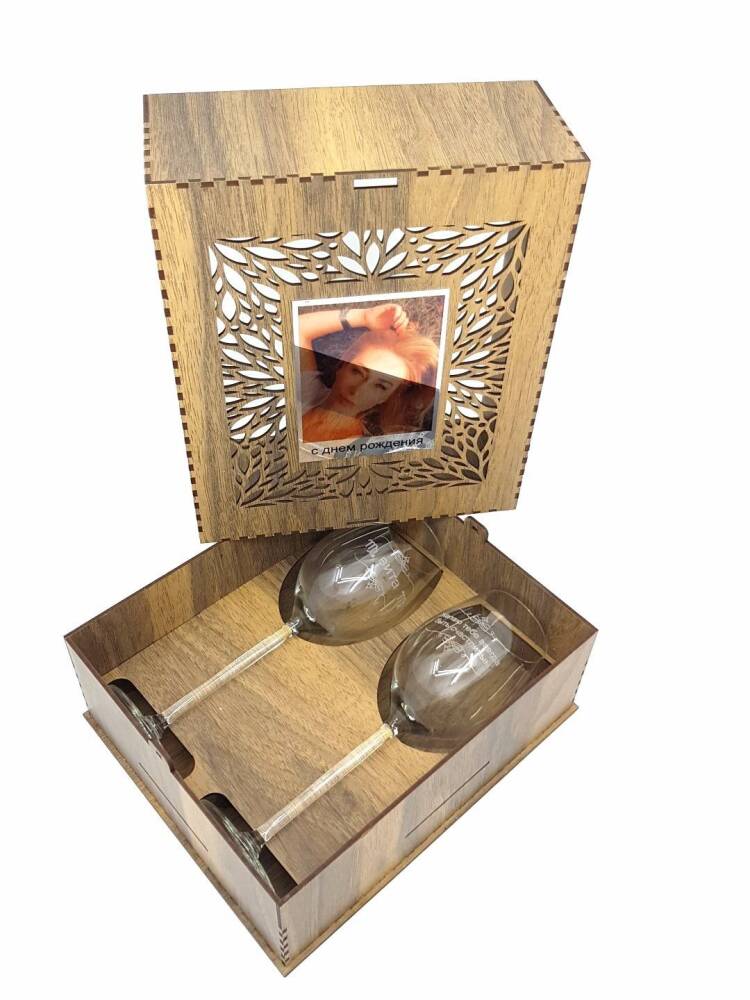Bu özel sette şarap bardağı üzerine lazer kazıma işlemi ile baskı yapılarak, özel üretim ahşap kutuda güzel bir hediye seti oluşturulmuştur. Lazer kazıma işlemi ile şarap bardağına istediğiniz tarih, isim ve logo işlenerek siz değerli müşterilerimizin beğenisine sunulmuştur.